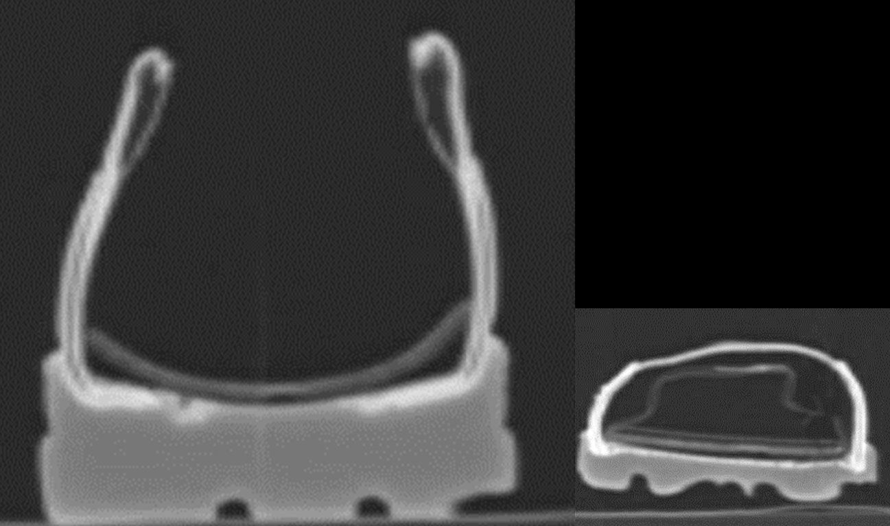 Damit lässt sich der gesamte Schuhinnenraum zerstörungsfrei darstellen und exakt vermessen. (Küper N., Becker N., Obens T., Claussen C. et al.: Bestimmung von Schuhinnenmaßen - Zerstörungsfreie Werkstoffprüfung mittels Computertomographie. FussSprunggelenk 3: 159-163 (2005 K))